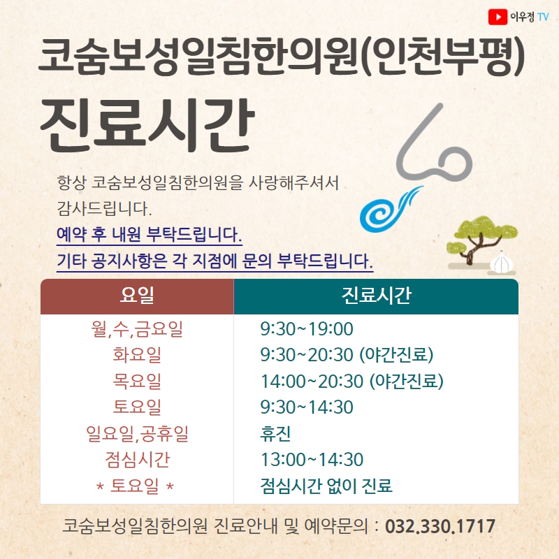 [진료시간 안내] 코숨보성일침한의원(인천부평지점)
