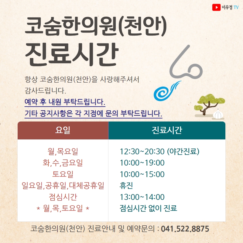 [진료시간 안내] 코숨한의원(충남천안지점)